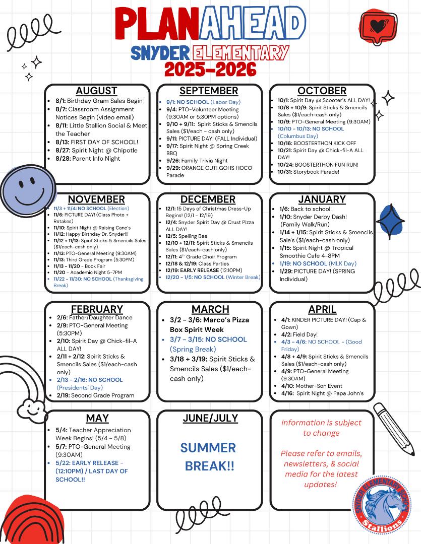 2025-2026 Snyder PTO Plan Ahead Calendar